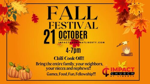 You're Invited to come out, October 21st from 4- 7pm here on Impact Church grounds for a time of fun, fellowship, and food. We have games lined up for both kids and adults. There will be smore's, hotdogs, burgers. We're excited to annouce a Chili Cook Off!! Bring your best chili, crockpot ready, and be named Impacts 1st Chili Champion. Maybe you're a baker instead, bring your best fall treat!! Let's connect outside of Sunday Service.